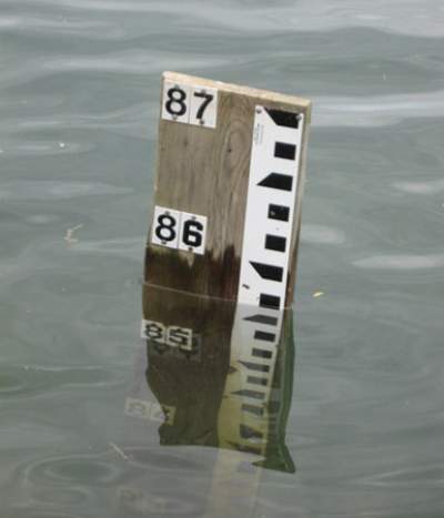 The traditional use for a staff gauge is to provide a visual way of determining the water level in some body of water (lake, river, flume, weir, etc.). Depending on the type of gauge, the level gradations can be anything desired - feet, meters, inches, yards, etc.