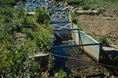 Passing through the throat, the flow expands in the discharge section of the flume. Expanding and slow, the flow become turbulent, serving to mix the alum into the water before it spills off the end of the flume.