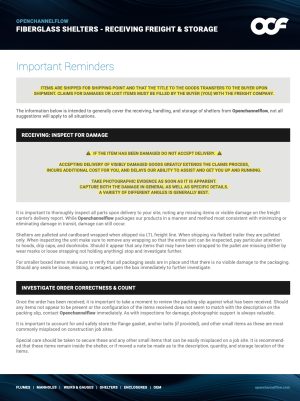 It is important to thoroughly inspect all parts upon delivery to your site, noting any missing items or visible damage on the freight carrier’s delivery report. While Openchannelflow packages our products in a manner and method most consistent with minimizing or eliminating damage in transit, damage can still occur.